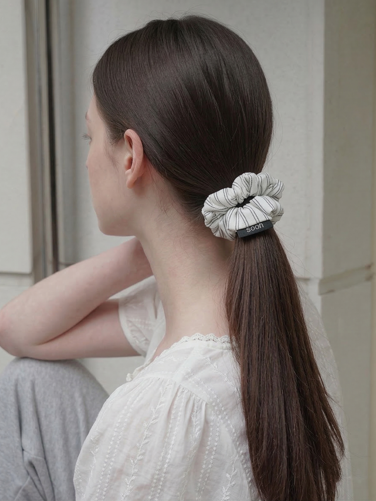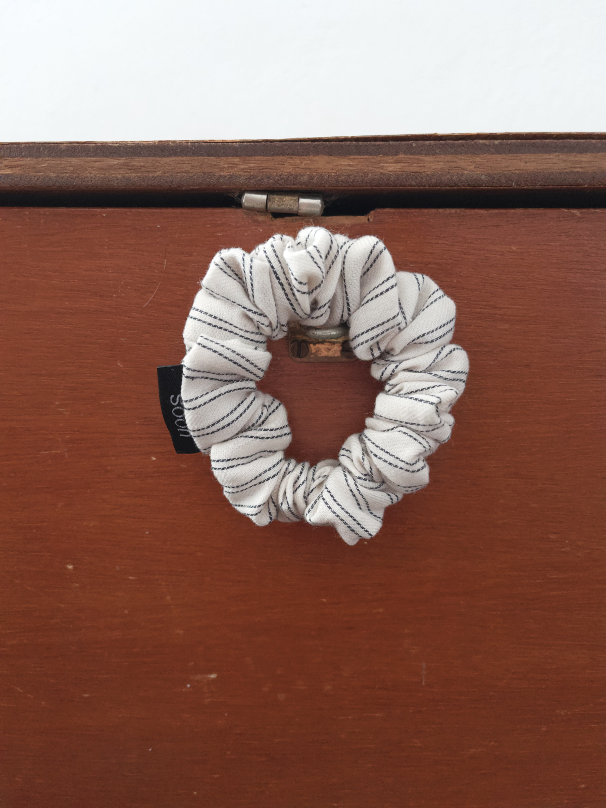 A crisp pinstripe scrunchie that matches your day as perfectly as your mood. Crafted from the same warm brown stripe fabric, soft on your hair and gentle enough for everyday wear. Wear it on your wrist, tie up your hair, or pair it with the Classic Stripe Cinch Pouch for a perfectly coordinated set.