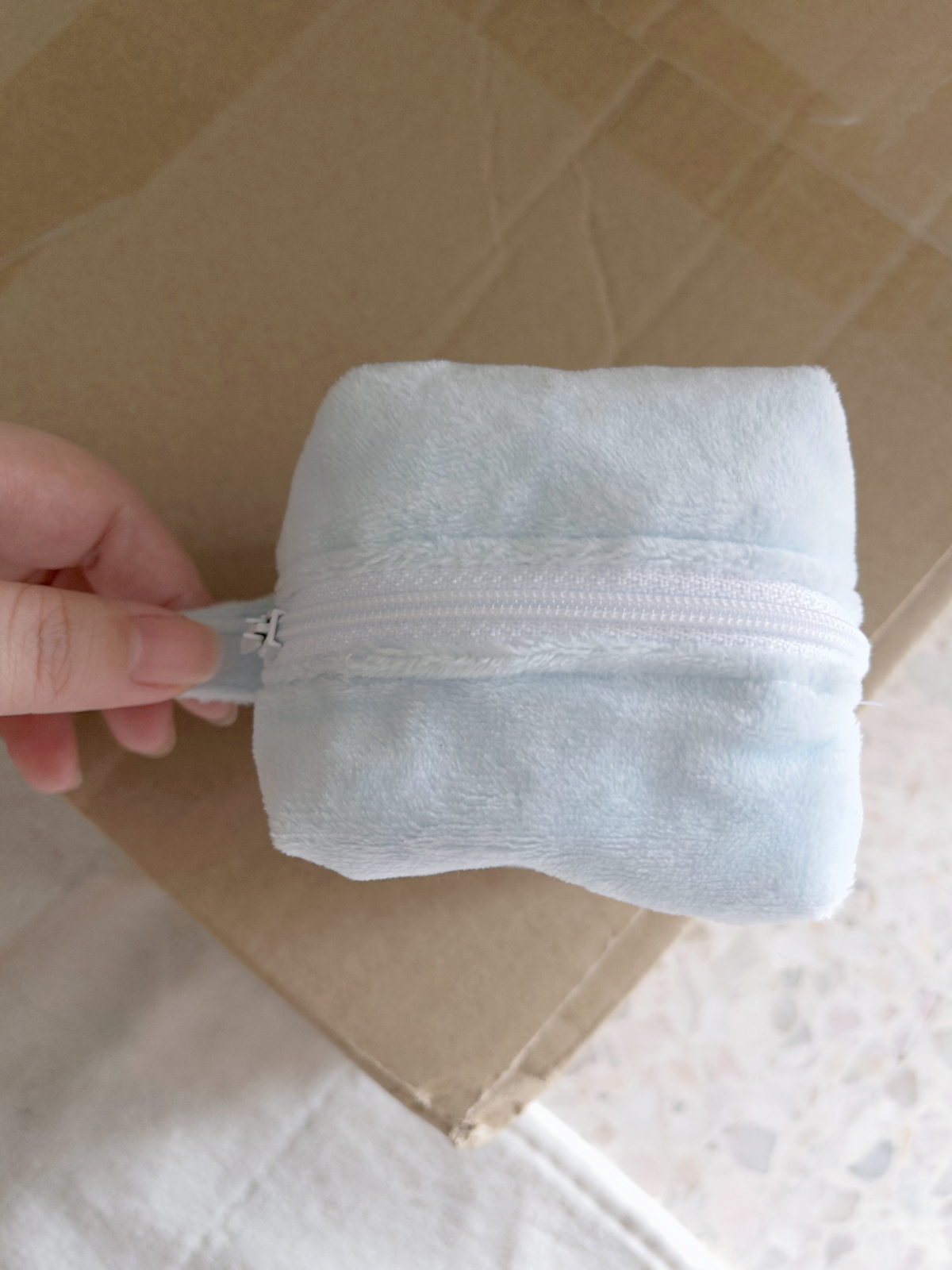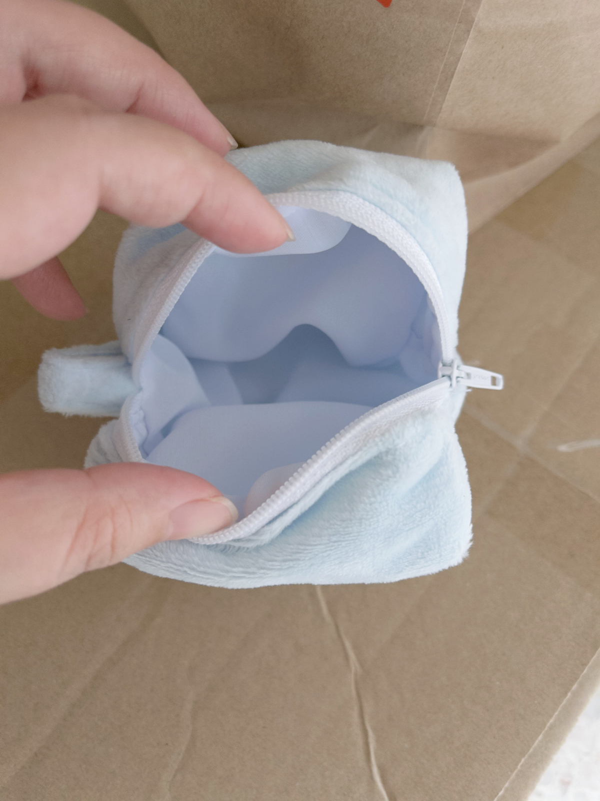 Soft, compact, and irresistibly fluffy. This mini zip pouch in dreamy light blue keeps your small essentials safe and close — coins, lip balm, earphones, or anything precious to you. The smooth white zipper opens easily and closes securely. A little cloud you can carry anywhere.