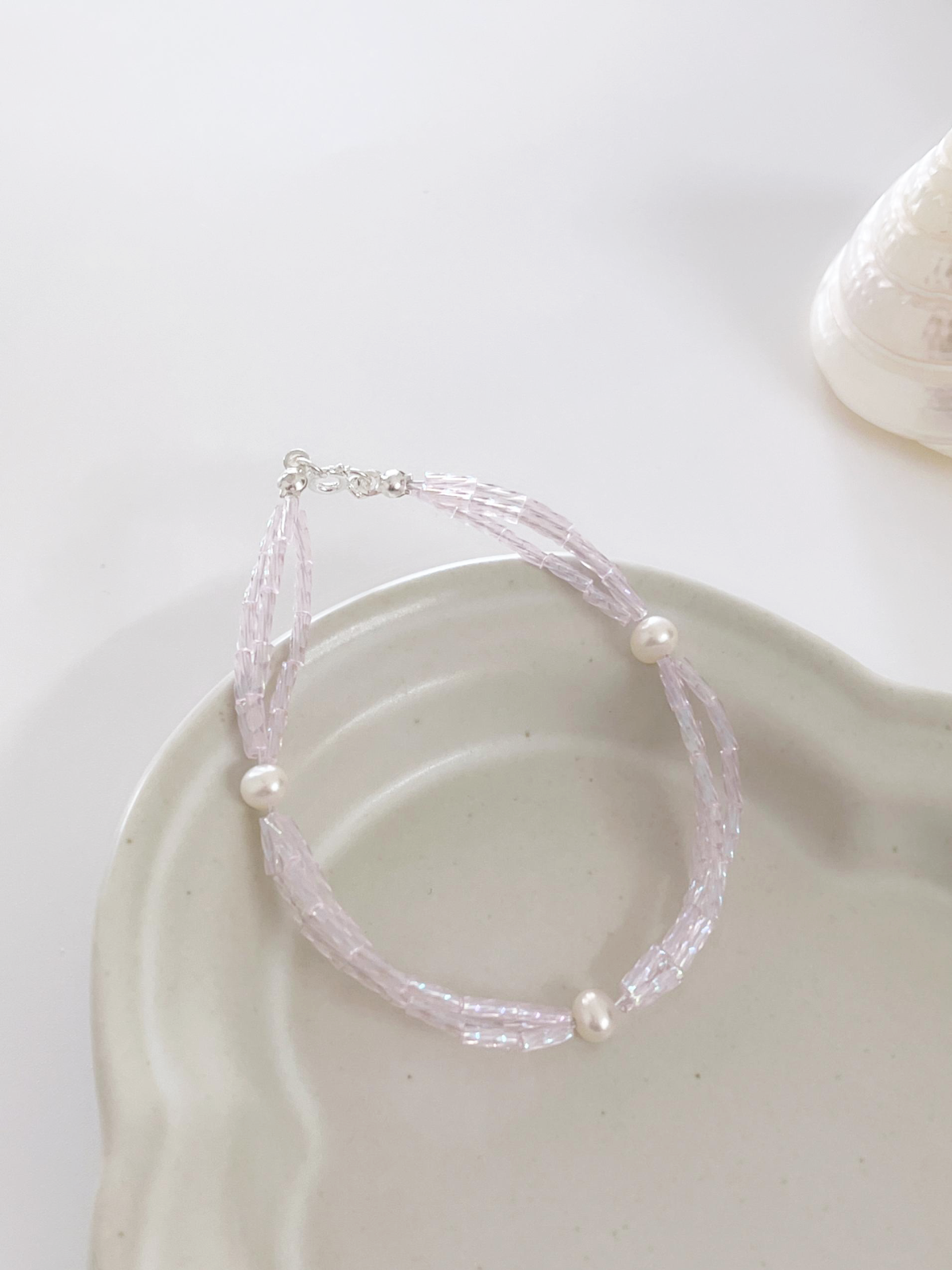 Three delicate strands of iridescent pink aurora glass beads, each one catching the light like the softest blush sunrise — punctuated by three small freshwater pearls that add a touch of quiet luxury. Finished with a silver clasp closure, this bracelet sits beautifully on the wrist, light as air and lovely as a dream. A piece that feels as special as the moment you put it on.