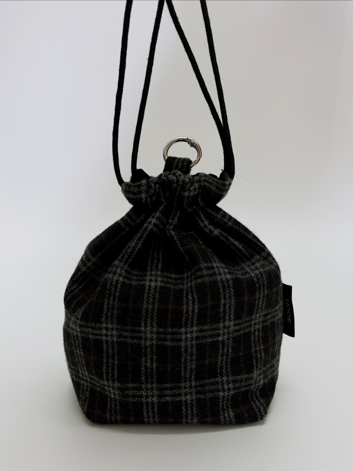 A deep black plaid cinch pouch bag with a matching black cord closure — bold, structured, and effortlessly cool. The classic check pattern adds texture and character to every detail. Compact enough for daily essentials, strong enough to make a statement. Perfect for those who carry themselves with quiet confidence.